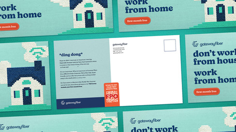 Introducing Homey Fibes, a tasteful digital cross-stitch with matching Rae Dunnish lines fit for a fiber home (and Nana’s). These evergreen assets further Gateway Fiber’s message of being friendly, fast and fair while playing up the strengths of their residential offering. And yet again, we pushed away from the market mainstream into something familiar and worth spending time with (like Mimi, Gran and Mumu).Â